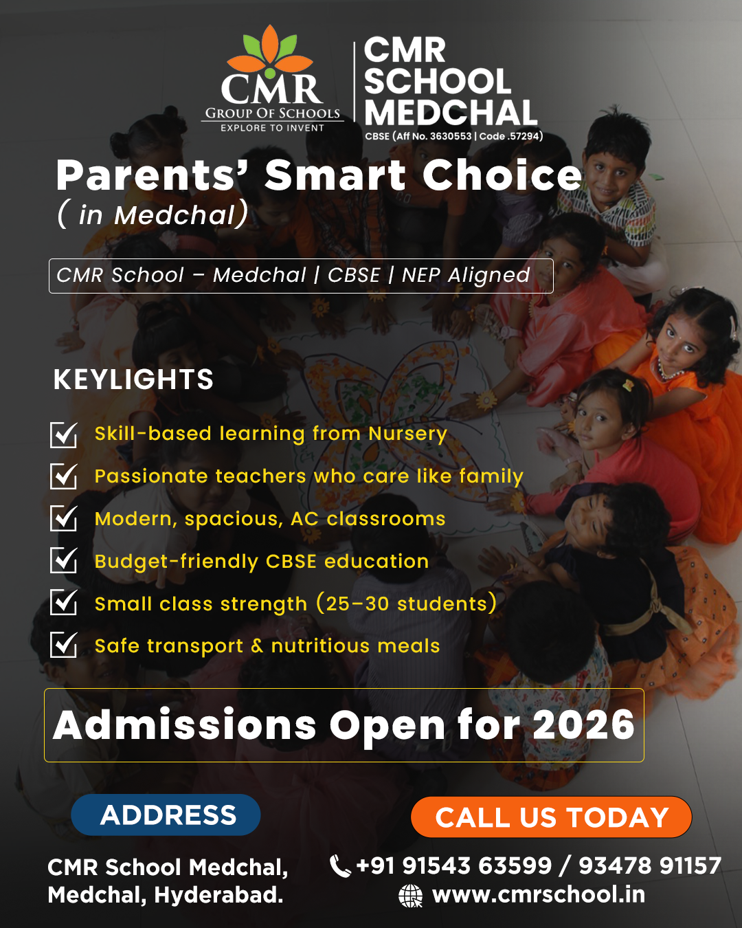 Your Gateway to Quality Education. Discover excellence in education with our CBSE curriculum from Nursery to Grade 10. Our smart classrooms ensure a modern, interactive learning experience, limiting class sizes to 35-40 students. Explore well-equipped labs, engaging activities, and robust sports facilities, including indoor and outdoor play areas. With a focus on holistic development, CMR School Medchal is the top choice for quality education in Medchal. Join us in our 2.5-acre campus, where learning meets innovation. Be a part of the 1st CMR School in Medchal, setting the standard for education with a commitment to excellence.